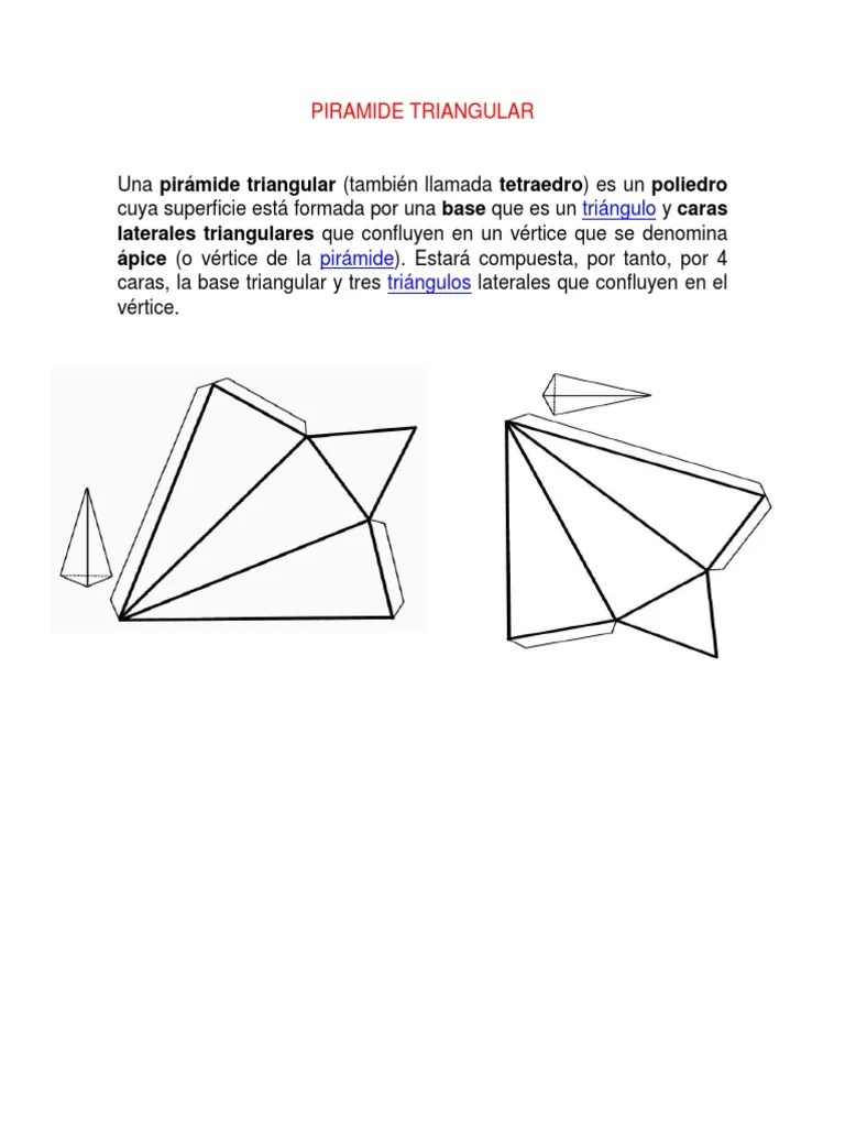 La pirámide triangular es uno de los diferentes tipos de pirámides, como cuadrangular, pentagonal o hexagonal. Pirámide triangular · tiene 4 caras · las 3 caras de los lados son triángulos · la base también es un triángulo · tiene 4 vértices (esquinas) · tiene 6 aristas . De esta forma, ¿que simboliza . Una vez armada la pirámide triangular podemos utilizarla para estudiar y comprobar sus características. Pirámide es un poliedro cuya base es un polígono cualquiera y cuyas caras laterales son triángulos con un vértice común llamado vértice de .